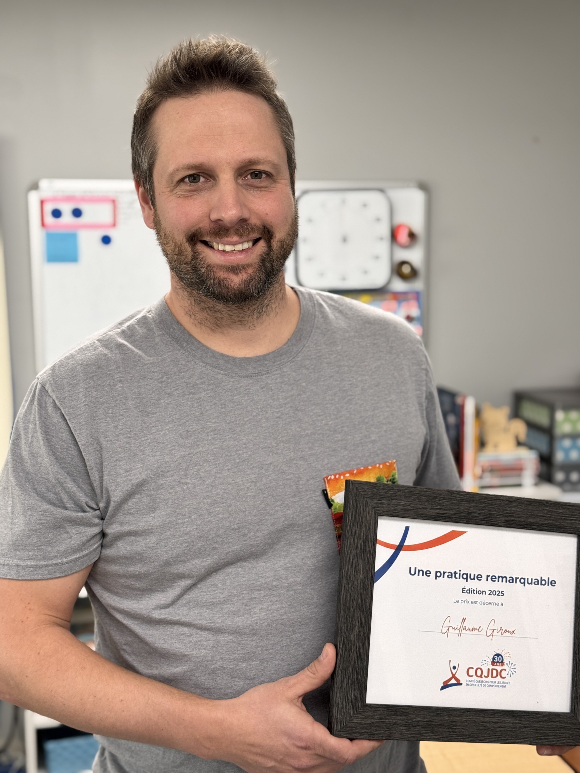 Guillaume Giroux est éducateur spécialisé pour les élèves présentant des difficultés comportementales, à l’école Sainte-Marie, une école d’expertise en gestion comportementale. Dans le cadre du projet Tremplin, les élèves reçoivent de la part de Guillaume, les outils nécessaires pour bâtir leur coffre d’outils en lien avec leur profil comportemental afin de vivre des moments d’intégration en classe régulière qui sont positifs. Il a fait du projet Tremplin une réussite par son implication à toujours vouloir améliorer le service, en collaborant avec la psychoéducatrice, la direction et les membres du personnel.